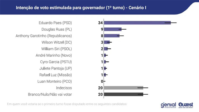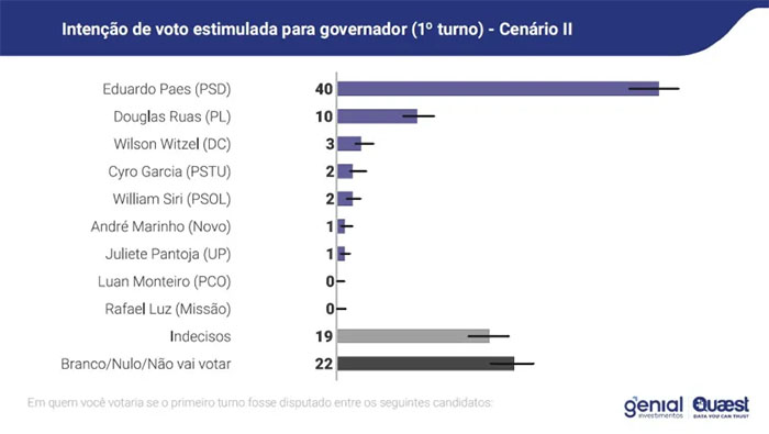 No cenário 2, sem Garotinho, Eduardo Paes cresce para 40%. Douglas Ruas aparece com 10%, enquanto Wilson Witzel marca 3% e Cyro Garcia e William Siri têm 2% cada. André Marinho e Juliete Pantoja aparecem com 1%, e os demais não pontuam. Os indecisos somam 19% e os votos brancos, nulos ou abstenções chegam a 22%.