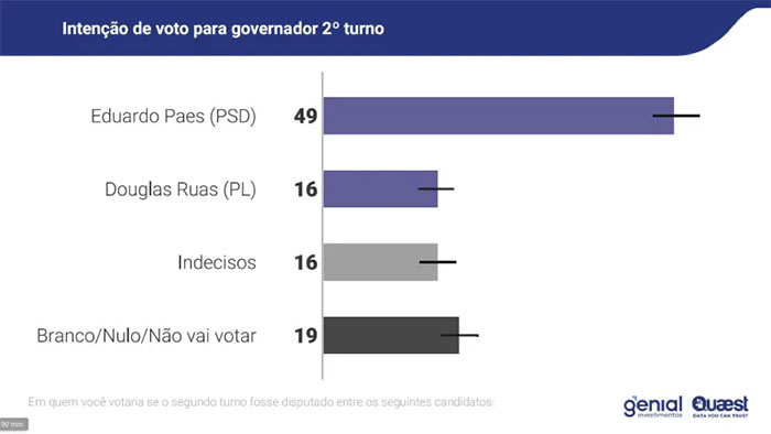 Em um eventual segundo turno, Paes venceria Ruas por 49% a 16%, com 16% de indecisos e 19% de votos brancos ou nulos.