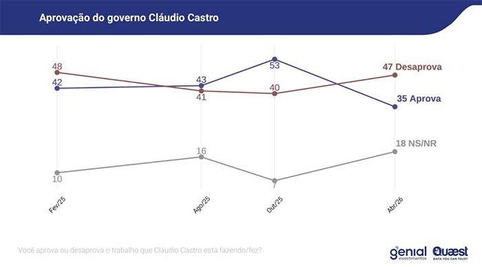A pouco mais de cinco meses das eleições, a aprovação do governo Cláudio Castro (PL) caiu 18 pontos percentuais. Em outubro do ano passado — quando foi realizada a operação Contenção nos complexos da Penha e do Alemão, resultando em 122 mortos — o governo era aprovado por 53% dos fluminenses; já no levantamento divulgado nesta segunda-feira (27), o índice caiu para 35%. A desaprovação cresceu de 40% para 47%.