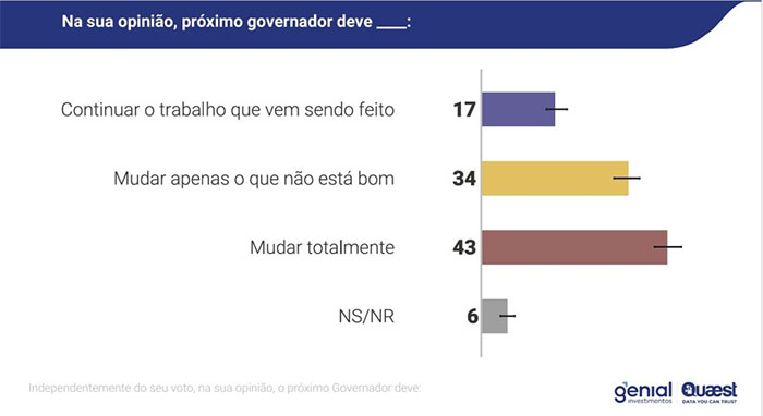 Para 43% dos eleitores, inclusive, o próximo governador deve mudar totalmente os rumos da administração estadual. Outros 34% acham que deve mudar apenas o que não está bom. Apenas 17% consideram que vale continuar o trabalho que vem sendo feito.