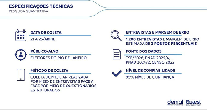A pesquisa Quaest, encomendada pela Genial Investimentos, ouviu 1.200 pessoas, em entrevistas pessoais, domiciliares e presenciais, entre os dias 21 e 25 de abril. A margem de erro é de 3 pontos percentuais, para mais ou para menos. Ela foi registrada no Tribunal Regional Eleitoral sob o número RJ-00613/20026.