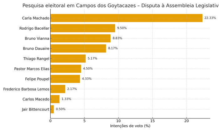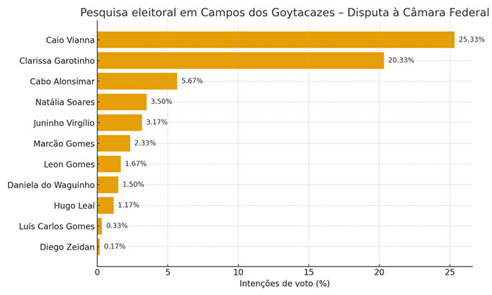 Realizado pelo professor Caio Lima, o levantamento aponta Caio Vianna com 25,33% das intenções de voto, seguido por Clarissa Garotinho (20,33%), Cabo Alonsimar (5,67%), Natália Soares (3,5%), Juninho Virgílio (3,17%), Marcão Gomes (2,33%), Leon Gomes (1,67%), Daniela do Waguinho (1,5%), Hugo Leal (1,17%), Luís Carlos Gomes (0,33%) e Diego Zeidan (0,17%).